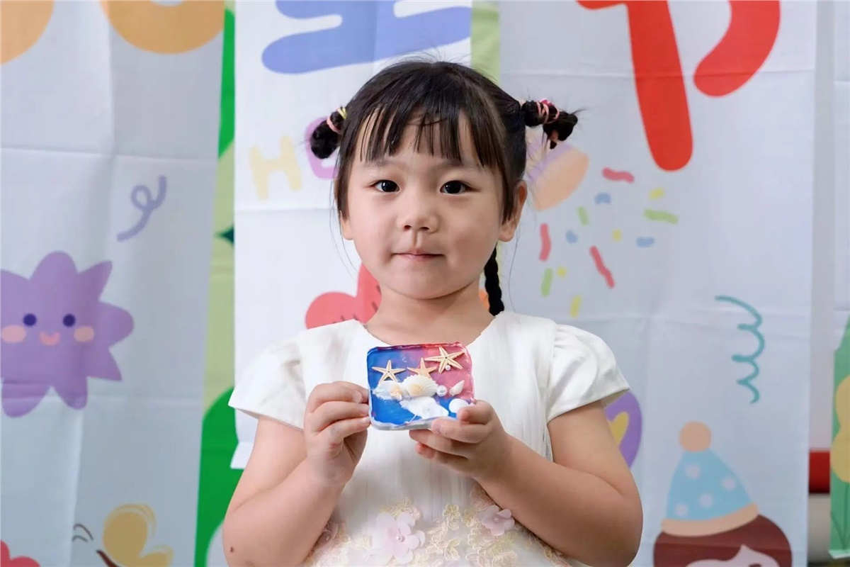 ▲在父母的陪伴與引導(dǎo)下,萌娃們用巧手將色彩斑斕的材料變?yōu)橐幻睹丢氁粺o二的創(chuàng)意冰箱貼。